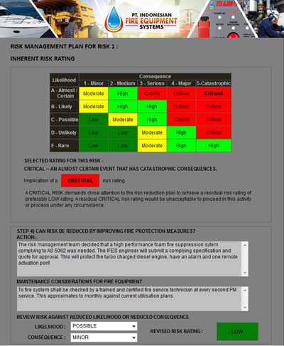 To comply to Australian Standard AS 5062 - 2006, it is mandatory to use a complying risk reduction procedure. The technical manager and commissioner of IFES, Mr Leigh Waldon has been using the process used in IFES for more than 15 years. This has helped major mining companies get real results with less fires with fire suppression systems that are more reliable and more successful at putting out fires.